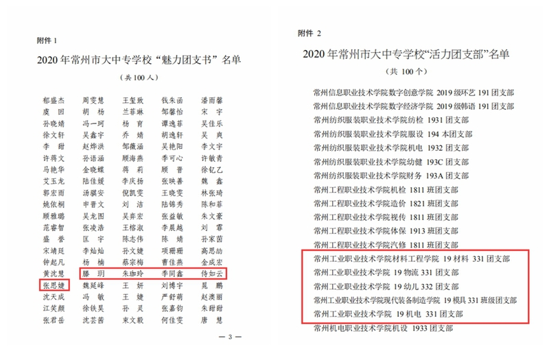 近日,常州市共青团委员会和常州市学生联合会联合发文《关于表彰2020年大中专学校“魅力团支书”“活力团支部”的决定》,授予我校侍如云等5名同学“魅力团支书”称号,授予19材料331等5个团支部“活力团支部”称号。